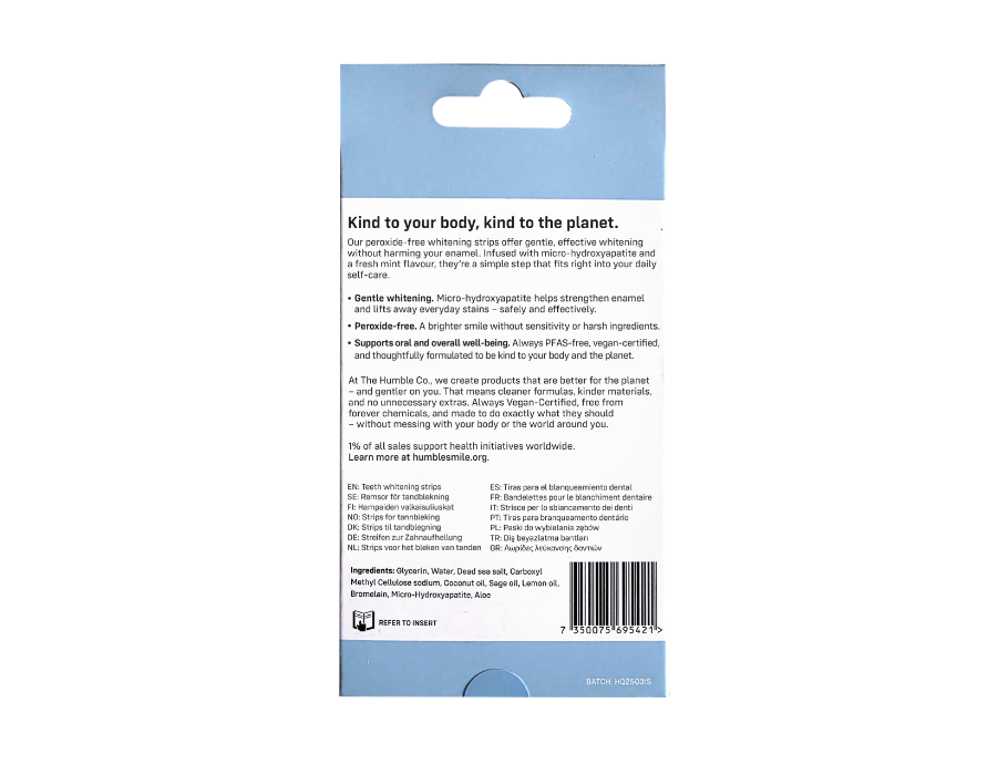 De whitening strips van The Humble Co. doen wat ze moeten doen: je tanden geleidelijk witter maken. De strips zijn gemaakt met een peroxidevrije, niet-agressieve formule die het glazuur helpt beschermen en je tanden geleidelijk witter maakt. Ze zijn getest op zichtbaar whitening resultaat, gecertificeerd door The Vegan Society en vrij van chemicaliën.